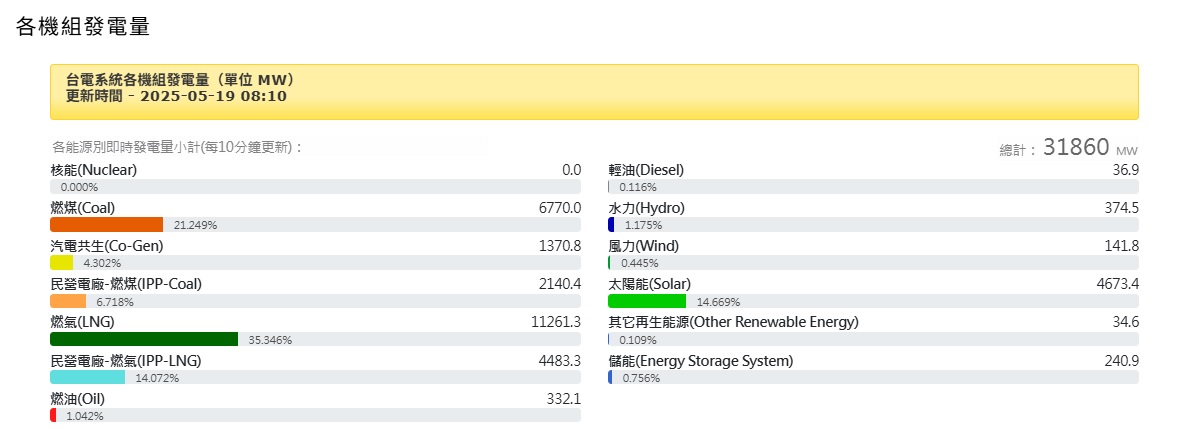 ▲ 图为5/19早晨8点10分台电系统各机组发电量。